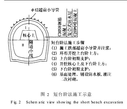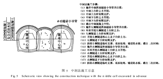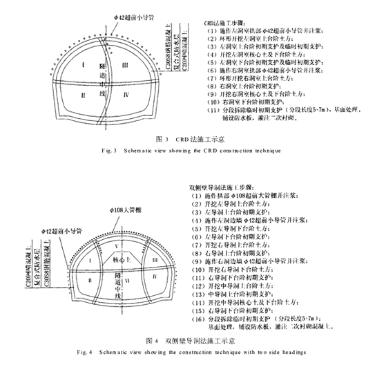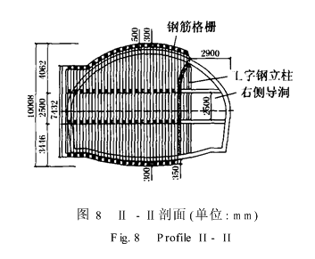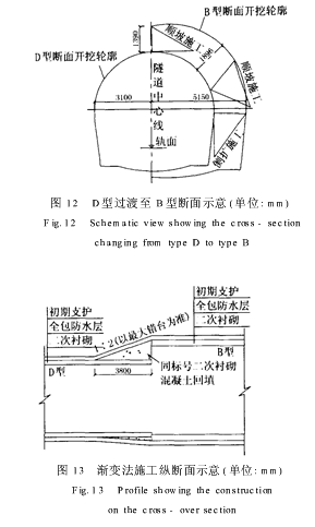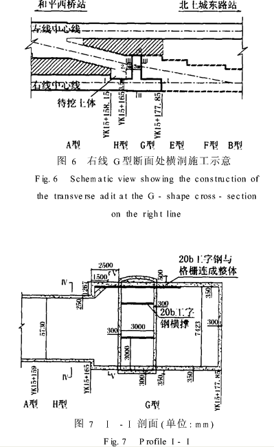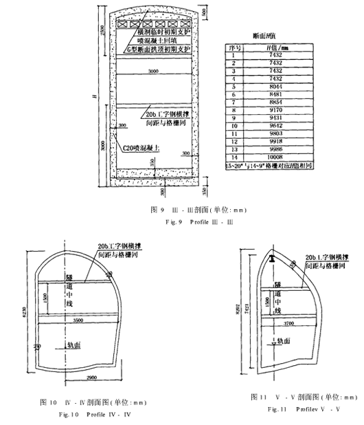 (1)A、C、D、J、N型隧道(洞室跨度5.8~7.3m)采用短台阶法施工(图2)。 (2)B、E型隧道(洞室跨度8.4~9.8m)采用CRD法施工(图3)。 (3)F、G、K型隧道(洞室跨度11.7~14.0m)采用双侧壁导洞法施工(图4),在F、G、K断面交界处施作扩大洞室作为管棚工作室,工作室长6m,外径比隧道横断面范围高出700mm。 (4)H、M型隧道(洞室跨度12.7~14.5m)采用中洞法施工(图5)。2.2 突变断面施工 本区间在增加渡线及与十号线联络后,共有12种结构断面隧道,有20处断面型式变化处,从而导致工法频繁转换,施工难度大。(1)区间右线渡线区大断面隧道施工 原设计右线隧道A型断面至G型断面过渡采用小导洞爬坡法进行,即由A、H型相接处利用小导洞爬坡至B型断面,然后从B型断面开始反扩,经过E、F断面,最后达G型断面。考虑到小导洞爬坡进料、出碴困难,通风效果差,且施工风险较高,工期长,废弃工程量大,根据北京市府地铁专家意见,原则上采用在G型断面处增加横洞,创造由大断面向小断面施工的条件,具体实施方法如下: 右线隧道台阶法掘进A型断面到H型断面处,采用导洞开挖至G型大断面,在纵向1.5m范围内渐扩成G型断面双侧壁导洞法右侧标准导洞,继续向前施工至G型断面右侧导洞终点,初期支护完成后在离H型断面2.5m处横向开辟一个施工横洞,破口处采用20b工字钢与前后格栅连成整体,横洞拱顶、隧底分别向上、向下扩大35cm,确保横洞初期支护不影响G型断面初期支护。 横洞形成后,安装G型断面拱部标准格栅及喷射混凝土,然后从横洞侧壁向北土城东路站方向破口,依次从大断面向小断面施工渡线区隧道。图6为右线G型断面处横洞施工示意图,其中各剖面分别见图7~图11。横洞施工采用双层小导管超前支护,小导管长2.5m,环向间距40cm,排距1m。30cm厚C20网喷混凝土初期支护,格栅主筋采用?Φ25,50cm一榀,侧墙采用20b工字钢对口撑两排,水平间距与格栅同,竖向间距根据开挖断面高度作适当调整,以保证不影响进料、出碴作业为准。与十号线联络线接口段大断面隧道施工参照渡线区进行。(2)区间左线渡线区大断面隧道施工 左线渡线区考虑到各种相邻断面隧道尺寸相差不大,可以采用渐变法施工,以D型断面变化至B型断面(短台阶法转换至CRD法)为例说明如下。 从D型断面过渡到B型断面,一侧错台尺寸为1.8m,最大错台为1.9m,开挖方式由短台阶法过渡到CRD法,设计为超前小导管支护,为保证安全过渡到大断面,采取?42小导管超前护顶稳扎稳打、步步成环的可靠施工方法,小导管参数不变,外插角调整为向上35°~40°,连接筋加密至50cm,且保证与前后格栅钢架连成整体。断面错台采取喇叭口扩宽顺接方式,顺接长度以最大错台尺寸为准,按1∶2坡度顺接。顺扩地段在小断面(即D型断面)内完成,以满足设计净空要求。待施作二次衬砌时,扩挖部分用同级混凝土回填,二次衬砌内轮廊仍按设计用台阶突变。图12为D型过渡至B型断面示意图,其剖面见图13。