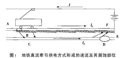 浅谈杂散电流腐蚀机理及防护措施摘 要 详细阐述了地铁杂散电流的形成机理及主要的防护措施。关键词 杂散电流;腐蚀;直流供电;轻轨交通 地铁或轻轨一般采用直流电力牵引的供电方式,一般接触网(或第三轨)为正极,而走行轨兼作负回流线。由于回流线轨存在着电气阻抗,牵引电流在回流轨中产生压降,并且回流轨对地存在着电位差,回流线对道床、周围土壤介质、地下建筑物、埋设管线存在着一定的泄漏电流,泄漏电流沿地下建筑物、埋设管线等介质至负回馈点附近重新归入钢轨,此泄漏电流即称迷流,又称地铁杂散电流。地铁迷流主要是对地铁周围的埋地金属管道、电缆金属铠装外皮以及车站和区间隧道主体结构中的钢筋发生电化学腐蚀,它不仅能缩短金属管线的使用寿命,而且还会降低地铁钢筋混凝土主体结构的强度和耐久性,甚至酿成灾难性的事故。如煤气管道的腐蚀穿孔造成煤气泄漏、隧道内水管腐蚀穿孔而被迫更换等。另外,地铁迷流同时也对地铁沿线城市公用管线和结构钢筋产生“杂散电流腐蚀”,影响地铁以外沿线公共设施的安全及寿命。本文结合我公司参与的多条地铁线施工和运营维护管理的经验,针对杂散电流腐蚀机理及防护措施方面浅谈管见。1 杂散电流腐蚀机理1.1杂散电流腐蚀机理 地铁迷流对埋地金属管线和混凝土主体结构中钢筋的腐蚀在本质上是电化学腐蚀,属于局部腐蚀,其原理与钢铁在大气条件下或在水溶液及土壤电解质中发生的自然腐蚀一样,都是具有阳极过程和阴极过程的氧化还原反应。即电极电位较低的金属铁失去电子被氧化而变成金属离子,同时金属周围介质中电极电位较高的去极化剂,如金属离子或非金属离子得到电子被还原。地铁直流牵引供电方式形成的迷流及其腐蚀部位如图1所示。图中,I为牵引电流,Ix、Iy分别为走行轨回流和泄漏的迷流。