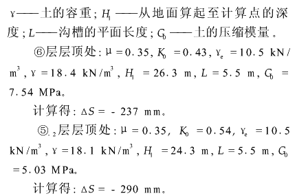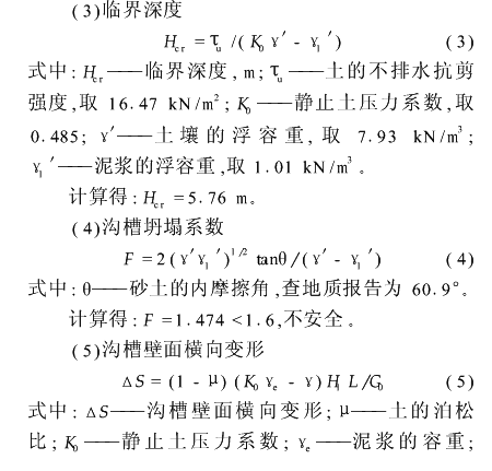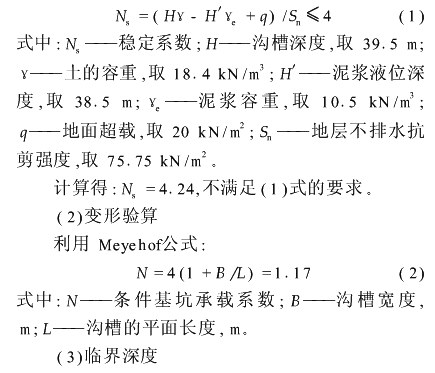 本工程地质条件复杂,对成槽施工非常不利,主要表现在以下几点: (1)③、④层淤泥质粘土缺失,①层为2m厚的杂填土,16m以浅为②-1、②-2层粉质粘土,由于②层土粘聚力微小,其抗剪强度几乎完全依赖自重应力,且带有显著的砂性,在动水压力下容易溃散,同样在地墙护壁泥浆的浮力作用下,自重应力被取消,主体抗剪强度将会完全丧失。而且该层又处于地槽浅层,护壁泥浆侧向压力相对又较小,显然②层土是成槽成功与否的关键所在。 (2)在第⑥层及以下是阻力很大的硬土层,其中⑦-1和⑦-2层通常作为桩基础的持力层,这对成槽机的切削能力和纠偏功能及成槽工艺的选择是严峻的挑战。 (3)该工程环境保护等级高,在12~21轴靠西端头井范围为一级基坑标准,该区域南侧是南浦大桥的引桥桥墩,最近的距地墙结构外边线仅3.5m,因桥墩基础长41m,仅深于该处地墙1.5m,抵抗侧向推力的能力较差,桥墩保护问题突出,而且在基坑未开挖时,桥墩已发生水平位移。2解决软弱表层在成槽过程中的稳定性问题,控制槽壁变形以及对大桥桥墩的影响 勘察报告显示,②层土的内摩擦角并不小,有26°,但粘聚力较小(11kPa),实际开挖后发现这层土几乎没有粘土的特征,在干燥状态下可以稳定地保持一定坡度,一旦淋雨就立即溃散。护壁泥浆一方面在水平方向对成槽壁施加压力,抵消主动土压力而起作用;而另一方面,泥浆在砂性比较明显的②层土所形成的泥皮不够坚韧,泥浆在铅垂方向上对土颗粒施加浮力抵消了土的自重作用,从而削弱了土的抗剪强度,所以即使有可观的内摩擦角,表层的深厚粉质粘土抗剪强度仍不足。为了验证,采用Meyehof公式对槽壁不同深度进行了稳定和变形验算。(1)稳定验算利用稳定系数法公式: