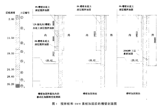 验证结果表明,不进行槽壁处理,成槽时槽壁的稳定和变形都不能满足要求。 原打算采用提高泥浆的密度和粘度等性能来满足护壁要求,但由于泥浆密度和粘度较大时对混凝土和钢筋的咬合不利,也增加浇筑水下混凝土的难度,并易引起钢筋笼沉放困难、混凝土钢筋笼上浮等诸多弊病,故弃而不用。 重新考虑采用改善土的力学指标,通过搅拌桩加固予以实现。加固后土体的强度远大于原状土,从经济角度以及今后成槽机纠偏时切削加固土体等出发,水泥掺量不宜过大,一般取7%。南浦大桥桥墩处,为了控制初期变形的累加,在地连墙与桥墩间增加了水泥掺量为20%的SMW素桩加固,在基坑内的被动区抽条加固部分,采取局部水泥掺量提高到12%。搅拌桩和SMW素桩加固后的槽壁剖面如图1所示。