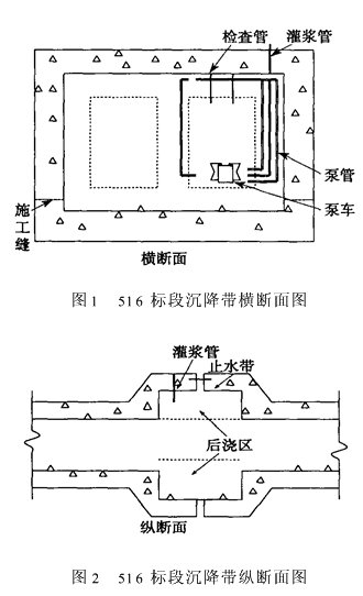 1沉降带外壳先浇混凝土的施工 外壳部分的施工同普通明渠开挖隧道的施工基本一样,即先浇筑底板,然后扎钢筋、封模板、浇筑墙及顶板砼等。但其沉降缝的表面要求较平整,如采用加入泡沫板隔离一次性浇筑,很难满足平整度的要求,故外壳部分最好分两次施工,并按图纸规定设置止水带,以防海水侵蚀,预留与后浇区连接的钢筋,在其顶部等间距预埋灌浆管。2 后浇区施工1)后浇区底板施工 后浇区的砼实际上是分两次浇筑的,第一次是底板外加20cm高的墙身(这样做有利于墙身模板的加固),第二次是墙同顶板。沉降带外壳施工完毕后底板预留的钢筋在海水的浸泡下锈渍斑斑,一定要除锈,底板的积水和泥浆也要彻底清除干净。绑扎好底板钢筋和墙体插筋后,加固好20cm高墙身的模板,便可以浇筑混凝土。2) 墙体及顶板部分钢筋绑扎 后浇区底板砼浇筑完的第二天,便可拆除20cm高墙身的模板,搭好后浇区段脚手架。在钢筋绑扎前必须将先浇砼的表面充分凿毛,保证砼之间的粘结力,清除预留钢筋的锈渍。因各方向的空间尺寸都受到限制,钢筋下料时要严格控制其外包尺寸。在常用的起重设备很难用上的情况下,单根钢筋不宜太长,可考虑适当搭接,采用不锈钢扎丝。钢筋绑扎过程中要穿插泵管的安装工作。3) 泵管安装 底板砼浇筑完后,便可按横断面图示安装泵管。砼从泵管底部向上行进,泵管承担的压力非常之大,安装前一定要检查泵管的质量,尽量选用质量可靠的新的泵管,表面不能有任何裂缝,以防浇筑过程中爆管。两边的外墙各安装3条泵管,中间墙安装2条(为清楚起见,横断面图中只标注了一半的泵管),泵管之间要保持一定的净距,出口依此错开,确保顶板每个位置能灌到混凝土。顶板泵管的水平部分应尽可能贴近先浇的混凝土面,即尽量高一点,这样砼从泵管中喷射出来,不会遇到太大的阻力。泵管要紧紧地固定在已绑扎好的钢筋网上,对转弯的部分要特别处理,如用爆胀螺丝将泵管固定在先浇混凝土上。浇筑过程中,在泵车的冲击力下,泵管的位移不能太大。泵管的入口处,即与泵车连接的部位要加设活动开关。砼浇筑完之后,拉下开关,拆除连接,泵管内的砼不会倒流。4)墙体及顶板部分封模板 钢筋绑扎、泵管安装工作完成后,便可以拼装加固墙体同顶板的模板。与隧道其它段相比,沉降带的模板没有什么特殊,本文不再详细描述。值得一提的是,模板加固完以后,按1m×1m等间距在模板上钻孔,插入检查管(PVC),管顶尽量高一点,当砼浇筑到管顶位置时,水泥浆就会顺管壁流下。砼浇筑完毕时,要及时将检查管拔出。5) 浇筑后浇区墙体及顶板砼 后浇区砼的强度要求很高,其墙体及顶板砼是在完全封闭的状态下浇筑,且钢筋、泵管密布,净间距小,这要求砼有良好的和易性和流动性,石子粒径不宜太大。为满足这些技术和施工要求,采用C45级砼,石子最大粒径100mm,坍落度120mm。原图纸规定的砼是C40级。考虑现场施工实际情况,需提高砼强度(浇筑过程中振捣不够,应适当补强),增加砼流动性,减小石子粒径,为此,对原设计进行了调整。当然这需要事先征得业主和设计单位的同意。浇筑砼前用高压水枪将后浇区的杂物全部冲走,采用附壁式振动器振捣,按顺序将泵车同埋在墙里的泵管相连进行浇筑。砼接近顶板时,将泵车移至隧道另一个箱室继续浇筑。施工过程中要注意控制砼的浇筑进度,不宜太快,墙身浇筑完后,中断半小时,开始顶板的浇筑。顶板里残余的空气通过检查管和灌浆管排出,直到每根检查管都有水泥浆流出,方可结束砼的浇筑工作。6)灌浆 在砼达到设计强度的95%时,拆除模板,泵管将像钢筋一样永远埋在砼中(一定程度上可以增加结构的强度)。浇筑砼42天后,着手灌浆工作。在密封的状态下施工,砼很难充满所有的空间,在后浇区的顶板位置有一些空隙是在所难免的,这只能通过顶部的灌浆管灌筑高压水泥砂浆来达到补强。3结语 香港地铁516标段沉降带后浇区在四周完全封闭的情况下,常用的施工方法和常规的施工机械都很难派上用场,特别在浇筑墙体及顶板砼的过程中,要严格遵循施工顺序,控制施工进度。