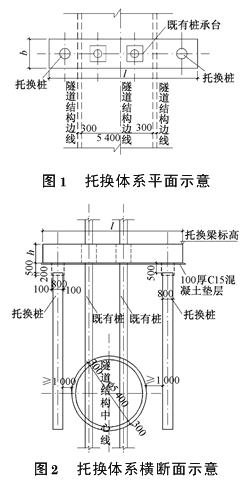 2 托换方案设计2.1主动托换体系 主动托换技术是指原桩在卸载以前,对新桩和托换体系施加荷载,从而部分消除被托换体系长期变形的时空效应,将上部的荷载和变形运用顶升装置加以动态的控制。当托换建筑物的荷载大、变形要求严格控制的时候,需要通过主动变形调节来保证变形要求,即在被托换桩凿除之前,对新桩和托换体系施加荷载,使被托换柱(墩)在上顶力的作用下,随托换梁一起上升,从而使得在被托换的桩截断后,上部荷载全部转移到新加的托换桩上,同时通过预加荷载,可以消除部分新桩和托换体系的变形,使托换后桩和结构的变形控制在很小的范围内。2.2托换方案 本设计采用主动托换体系。托换桩为钻孔灌注桩,托换梁采用钢筋混凝土梁。在隧道结构线外1m范 围外设置φ800mm灌注桩。承台两侧设置梁,承台和梁之间进行植筋处理。加载设备为QF500 20型千斤顶及配套油泵,千斤顶行程为200mm,千斤顶最大压力5000kN。桩顶标高由既有承台底标高、托换梁支座处高度、千斤顶初始工作空间决定。如图1、2所示。