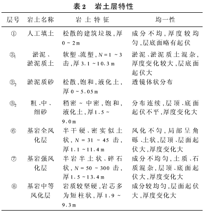 1.2隧道概况 本段为盾构法施工,隧道结构外径为6.0m,结构厚度300mm,隧道埋深较浅,隧道顶部至地表大约为10~15m。由桩长及隧道埋深可知,进入隧道的桩基贯穿整个隧道。1.3地质概况 该段地质属河流堆积地貌,地势平坦,隧道通过地段为饱和中细砂,拱顶为中~高灵敏度且宜液化的淤泥质砂,上覆层含水层厚,富水性强。地质概况如表2所示。