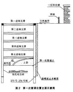 场区地下水分布为浅层潜水和深层承压水。 浅层潜水属孔隙性潜水类型,主要赋存于上部①层填土和②层粉土、粉砂中,补给来源主要为大气降水及地表水,地下水位随季节性变化,勘探期间测得地下水位埋深0.85~3.45m。承压水主要分布于深部的⑧-1层中细砂和⑧-3层圆砾夹卵石中,水量较丰富。隔水层为上部的粘性土层(⑤、⑥层),承压水头埋深约在地表下5.00m,即黄海高程3.62m。3 工程特点 (1)基坑开挖深度较大,最深达18m; (2)基坑周围地下管线密集,邻近建筑物多,环境条件较差; (3)基坑地层主要为砂质粉土,开挖时极易产生侧向变形、开挖面隆起而引起边坡失稳及基坑涌水等不利现象; (4)基坑底有淤泥质粉质粘土下卧层(层面距离坑底约5m),该层物理力学性质指标尚可,渗透系数较小,对于坑底抗管涌比较有利。 总之,场区地下水位高、土渗透系数大。同时粉土、粉砂地层对基坑涌水极为敏感,围护结构一旦漏水影响范围很大,因此地下水位的控制和保证围护结构的止水性能是工程成败的关键。4管涌情况 工程由于受拆迁及秋涛路交通疏解的影响,为确保总工期不变,将车站以秋涛路为界,分为东、西两区施工。在秋涛路中心(主体17轴处)设临时封堵墙(咬合桩墙),先封闭东区基坑,进行东区基坑开挖和主体结构施工。 开挖自2004年8月11日开始,2005年1月6日结束。施工期间共出现2次管涌,第一次管涌时间为2004年11月2月下午17∶10,管涌点位于第11段基坑南侧273号~274号桩间坑底,到20∶30处理完共涌出泥砂约240m3。涌水前第11段基坑已基本开挖到设计标高,开始进行清底。273号~274号桩间渗漏处理也接近基底。 管涌造成基坑南侧(距基坑边约20m)1幢三层居民楼向北侧倾斜,围墙出现裂缝,裂缝宽度最大达10cm左右;南侧原婺江路面下沉,最大下沉量约50cm;婺江路地下水管开裂,造成自来水供应中断。管涌波及范围:273号~274号桩向南最远达44.5m,向东约39.7m,向西约12m。 第二次管涌时间为2005年1月10日下午14∶10,管涌点位于第8段基坑内,距第9段底板(已浇注完成)端头约5m处。管涌前第8段基坑垫层、防水板及细石砼保护层已施工完。到20∶10处理完共涌出泥砂约40m3左右。处理过程中发现基坑南侧距第一次管涌点以西约10m处地面出现轻微裂缝,最大裂缝宽约5mm,长约10m,沿基坑纵向分布,影响范围向南最远达20m左右。地面最大沉降3cm。未造成其它建筑物损坏。 两次管涌点平面位置示意如图1,立面示意见图2、图3。