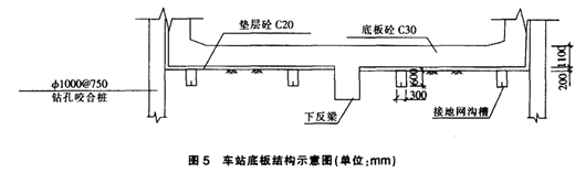 Ks=ic/i(1) 式中:Ks———抗管涌或抗渗流稳定性安全系数,取1.5~2.0;ic———坑底土体临界水力梯度,ic=(Gs-1)/(1+e);Gs———土粒比重,取2.7; e———坑底土体天然空隙比,取0.85; i———坑底土体渗流水力梯度,i=hw/L; hw———基坑内外土体的渗流水头m,取坑内外水头差hw=14.5; L———最短渗径流线总长度m,L=14.5+2×3(旋喷桩深入基底下3m计)。 经验算,当旋喷桩深入基底下3m时: Ks=ic/i=0.919/0.71=1.29<(1.5~2.0) 验算结果表明,咬合桩开叉处旋喷桩止水帷幕的深度没有满足抗管涌稳定性要求(经验算止水帷幕深度应伸入基坑底以下不小于5m)。显然,咬合桩开叉以及旋喷加固措施不够是发生管涌的主要原因。5.2第二次管涌 管涌发生后立即将漏水处防水板揭开,发现漏水点位于接地网沟槽处,直径约20~30cm,水流方向自东向西(即由第9段底板下流出)。由于管涌前基坑内降水工作曾因停电而停止降水半小时,坑内水位升高,地下水沿接地网沟槽涌出并突破较薄弱的接地网沟槽垫层而涌入基坑。 管涌处理进行约2小时后,发现第10段基坑南侧(24轴处)地表有2~5mm宽裂缝,同时测得位于24轴处的坑外水位监测孔SW8水位下降了3m多。据此推断,基坑24轴附近的咬合桩在底板以下开叉,基坑外潜水从基底以下咬合桩开叉处进入基坑内。 此次管涌发生的主要原因: (1)由于坑底以下咬合桩开叉使坑内外地下水连通,1月10日中午停电后,基坑内降水中断,坑外水位升高,坑内外水头差增大,抗管涌稳定安全系数降低,从而导致管涌发生。 (2)坑内降水中断后,也使坑内水位上升,并对底板产生压力,结构较松散的接地网沟槽回填土受到破坏,形成空洞,使底板下高压水沿着接地网沟槽涌入第8段垫层下,从后浇注的强度低、较薄弱的接地网沟槽垫层处涌出。如图5所示。