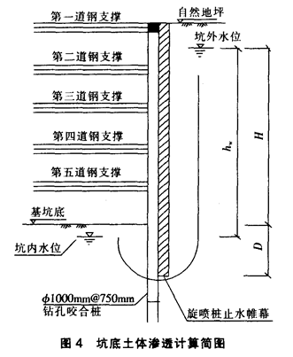 5 管涌原因5.1 第一次管涌 主要原因为咬合桩开叉,根据施工记录,273号、274号桩成孔过程中因套管钻头变形,造成桩垂直度偏差。8m以后两桩之间出现开叉,开挖到坑底后开叉量达15cm左右。根据施工记录和实际开挖情况,基坑开挖到7m后,即提出在桩后施作3根高压旋喷桩,旋喷深度根据经验确定为基底下3m的止水加固方案。根据抗管涌稳定性验算,此时实际水力梯度大于临界水力梯度,随着基坑开挖深度的增加随时可出现管涌失稳破坏。如图4所示,可通过式(1)验算基坑底部稳定性。