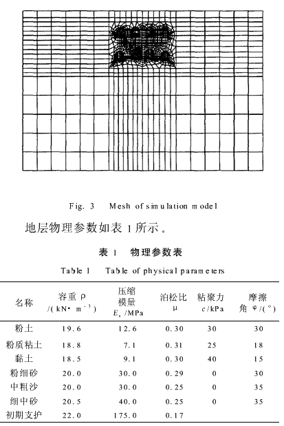宣武门车站是一座全暗挖车站,车站采用洞桩工法施工,风道、出入口通道及换乘通道采用CRD工法施工。车站宽24m,长189m,主要包括车站两端双层段、过既有地铁站单层段、车站两端双层风道、四条出入口通道及与既有车站进行换乘的四条换乘通道。车站断面见图2。 横穿车站的地下构筑物主要有盖板河(其底板距车站双层断面顶部净距为1.77m)和既有环线车站(其底板与车站单层断面顶部净距为1.9m)。由于距离近,车站暗挖施工时应采取可靠措施确保地下构筑物的正常使用和车站的施工安全。 本站施工范围内热力、电力、上水、下水、煤气、电信等各种地下管线89条,均位于车站主体上方,进行暗挖作业时,需采取可靠措施控制沉降,保证环境安全。3 数值计算模型及结果分析3.1 计算模型及物理参数 模拟计算中土体采用Mohr-Coulomb模型,计算模型及网络划分见图3。