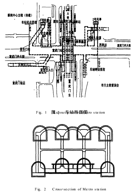 浅埋小间距隧道开挖围岩变形及控制对策摘要:采用FLAC软件对地表有相对硬壳层的粉沙层中隧道开挖之后地层的变形机理进行模拟,通过分析隧道开挖后围岩变形的空间效应特性曲线,确定隧道开挖支护后引起的围岩变形的幅度和范围,找出隧道开挖最不利荷载工况和结构薄弱部位,为施工方案提供理论依据和决策支持。研究表明,不同的施工顺序引发不同的施工力学状态,进而引起不同的施工力学效应,隧道开挖先后顺序不同对围岩区域、幅度的扰动也不同。以北京地铁某车站的实测为基础,分析了粉沙地层中隧道施工不同工序引起的各部分变形情况,进而提出了相应的工程措施。关键词:隧道;小间距;围岩变形;控制对策1前言 随着我国城市大规模地下空间开发利用的蓬勃发展,由地下工程开挖而引发的环境问题(主要是指施工过程中由地层变形失控所引起环境灾害,包括地面建筑物、道路、管线等构筑物的损害)已成为城市现代化建设中的一个亟待解决的问题。因此,研究城市地下工程开挖过程中地表沉降及围岩变形的有效控制问题,对于隧道周边环境保护具有十分重要的意义。其中,关于城市地铁开挖顺序的优化分析、围岩变形及控制对策研究是一个重要的研究课题。 由于城市地铁区间隧道洞群工程具有分期分部开挖、逐步形成洞室设计体型的特点,加之隧道围岩具有非线性力学特性,隧道施工导致隧道初期支护、主体结构和围岩的力学状态为不可逆的非线性演化过程。它的最终状态(或最终解)不是唯一的,而是与过程相关,或说是与围岩应力路径或应力历史相关的。显然,隧道施工方案的确定以及优化就有一个过程的优化问题,在施工前进行动态施工力学的优化分析及围岩变形机理及对策研究,以便采取合理的开挖顺序、适时有效的支护方案,结合信息化动态施工,确保施工及环境安全始终处于安全可控制状态。2工程概况 某地铁车站位于北京宣武门内、外大街与宣武门东、西大街的交叉路口,附近地面建筑物主要有越秀饭店、庄胜崇光百货、中国图片社、市天主教爱国会南教堂,西北侧有一、二层低矮平房。暗挖距建筑物较近,车站施工对周边地面建筑物影响较大,见图1。