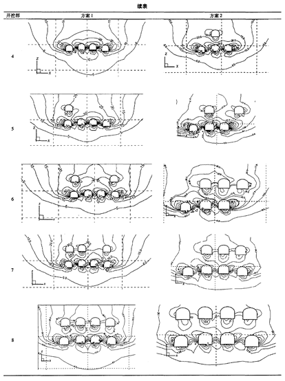 3.2隧道开挖布置 隧道开挖布置如图4所示,施工开挖方案1施工顺序为1、2、3、4、5、6、7、8,施工开挖对比方案2顺序为4、1、3、7、6、8、2、5。