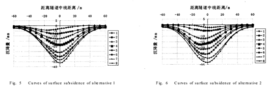3.3计算结果 (1)不同施工方案引起的地表沉降曲线如图5、图6所示。