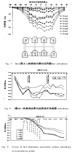 图7为一横向主断面分步累计沉降图,其中以每个小导洞通过该断面作为一步。图8为8个小导洞全部通过后的5条纵向主体地表的累计沉降分布曲线。图9为典型测点累计沉降历时曲线图。由图7、图8、图9的实际量测结果综合分析可以得出地表沉降的如下特点: ①导洞施工阶段,车站上方地表累计沉降平均为35mm左右,累计沉降最大为46.91mm。位于车站K7+780右中导洞上方,受导洞开挖影响,地表沉降速率最大时为-3.8mm/d,导洞全部开挖完成后地表沉降已趋于稳定。 ②根据地表纵向累计沉降图,施工通道及盖板河上方附近区域地表沉降较小,车站里程K7+765~+785、K7+800~+825段地表沉降较大。主要原因为施工通道部位土质主要为粘土层,自稳能力较好,而沉降较大的两个区域主要为粉质沙土层,自稳能力差,且该段地层内管线分布较多,局部渗水较严重。K7+800~+825段更是位于导洞扩大段,且其上部土层主要为人工杂填土,空洞较多。 ③根据地表横向分步累计沉降图,导洞施工导致地表沉降的范围为车站中线左右25m范围之内,导洞沉降主要发生在导洞正上方,车站中线12m外,地表累计沉降即迅速减小。 ④根据地表测点累计沉降历时曲线图,测点累计沉降主要发生在导洞开挖通过测点的阶段;洞内挖孔桩施工对地层变位影响较小,期间地表沉降速率约为0.1mm/d,但持续时间较长。4 施工控制对策4.1超前注浆预加固 由于该隧道处于细砂及砂卵石层中,导洞开挖之前,必须对导洞拱部进行注浆加固。注浆采用酸性水玻璃,施工时注意酸性水玻璃凝固的时效性。4.2超前大管棚 上导洞处于砂层,采用φ121大管棚进行超前支护。大管棚采用夯管锤夯进,先夯后取土,并预留注浆孔,注水泥浆对地层加固。 下导洞处于砂卵石层中,采用超前小导管注浆加固。4.3控制施工步序 ①拱部环形开挖预留核心土,上台阶控制3m左右,下台阶紧跟,及时封闭成环。 ②初支成环后及时背后注浆回填,减少岩层二维应力持续时间,缩短三维应力形成时间。尽快达到新的应力平衡。 ③相邻上下导洞间错开15m左右距离,减小相互间因开挖而造成的影响程度。4.4信息化动态施工 以往的理论研究和施工实践均表明,在地下工程施工过程中,地层应力状态的改变将直接导致结构产生位移和变形,同时也会对地表及周边环境造成一定的影响。当这种位移和影响超出一定范围,必然对结构产生破坏,并影响到上方地表和临近建筑的安全使用。充分发挥监测的指导作用,根据监控量测数据的变化情况,及时调整施工组织及工序,使施工处于安全状态。5 结语 ① 隧道施工导致隧道初期支护、主体结构和围岩的力学状态为不可逆的非线性演化过程,它的最终状态(或最终解)不是唯一的,而是与过程相关。地表沉降槽是随施工方案不同而不同,沉降槽中心随开挖部位先后的不同而不同。 ② 由于开挖顺序不一样引起的地表沉降量和沉降槽的宽度也不一样,在施工过程中应选择合理的施工方案,有利于保护隧道上部建筑物、管线等,同时还要采取积极的施工措施确保隧道上方环境安全。 ③应用FLAC计算程序,对浅埋、小间距隧道群进行位移场、破坏场和应力场变化特征的数值模拟研究,所得结论适用于软岩隧道情况,对确定软岩隧道的关键部位及在关键部位实施有效的耦合支护措施,有重要指导意义。 ④施工过程中必须加强施工监测,根据监测成果实施动态施工,以确保施工安全。参考文献:[1]孙钧,汪炳鑑.地下结构有限元法分析[M].上海:同济大学出版社,1988.[2] GB50299-1999,地下铁道工程施工及验收规范[S].北京:中国计划出版社,1999.[3]徐林生,孙钧,蒋树屏.洋碰隧道CRD工法施工过程的动态仿真数值模拟研究[J].地质灾害与环境保护,2001,12(1).[4]丁春林,王春河.双线隧道暗挖施工技术及数值模拟研究[J].地下空间,2002,12(4).[5]周顺华,张先锋,佘才高,等.南京地铁软流塑地层浅埋暗挖法施工技术的探讨[J].岩石力学与工程学报,2005,(3).[6]吴波,高波,漆泰岳,等.城市地铁区间隧道洞群开挖顺序优化分析[J].中国铁道科学,2003,10(5).