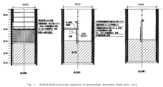 北京地铁过含水砂层施工对策摘要:结合北京地铁五号线磁器口至崇文门区间隧道及崇文门东站的工程实际,比较详细地论述了该区间隧道临时施工竖井和施工横通道、崇文门车站东南风井及风道过含水砂层时所采用的施工方案,介绍了防止涌水涌砂、避免产生过大降沉的方法,以及结合具体地质情况所采取的降水措施。关键词:含水砂层;施工对策;降水盲区1工程概况 北京地铁五号线05标段即磁器口至崇文门区间及崇文门车站,在五号线的南端,线路南北走向,基本垂直于北京冲洪积扇,属于永定河冲洪积扇的中下部,地处于北京城区较富水区(浅层水井单口出水量为20~30m3/h)。地下水位北高南低,北部地下水埋深一般3~6m,南部地下水位埋深5~14m,局部地段起伏较大。地面标高为44m左右,地层主要以圆砾、砂砾卵石为主,一般有厚层粘性土分布其间。含水层厚度8~12m,地下水基本流向为由西北向东南,水位埋深17~19m,含水层渗透系数50~80m/d。 本标段采用管井结合辐射井进行深层降水。因各方面原因降水井施工滞后,且不能在短时间内形成无水施工的作业条件(根据后期降水效果,本地区降水工作应超前土建施工3~4个月),并且该标段地下管线众多,场地狭小造成降水井布设断点,形成降水盲区,降水的缺憾造成地层中滞留大量残留水给竖井及隧道开挖带来很大困难。2 施工对策与方案2.1 区间临时施工竖井过含水层施工 磁-崇区间临时施工竖井断面为长6.0m,宽4.6m的矩形,竖井场地由民房拆迁形成,地下6~7m为杂填物,废旧管线较多。在结构周边内共布置15眼管井,竖井施工至标高28.69m时,发现潜水层层面为粉细砂层。为保证正常施工,在等待降水的同时,采取了竖井内大口井降水施工(直径1.6m)、增加钢格栅锁脚管和加强回填注浆的方案,挖至标高25.50m为粉质砂层,并出现大量涌砂、垮塌现象,无法继续施工。通过大口井降水的施工对地质情况进行了超前探测。发现在标高23.5m处为地质分界线,其下为5m厚的粘土不透水层,为潜水层的隔水层。提出分侧开挖的施工方案,施工步骤如下,并见图1。