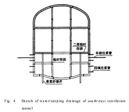 ①以风道二层临时仰拱为施工平台,采用小型螺旋钻机超前施做孔径为240mm、纵向间距1000mm、深8.5m的砂渗井,将含水层中的水渗排至降水效果显著的承压水层; ②根据前阶段的施工经验,在含水层上方仍会有10~15cm的残留水无法完全疏干,为了减小该层水对土层的影响范围及尽快使结构临时封闭,在含水层上方20cm处设置临时仰拱; ③风道三层分上下台阶施工后,上台阶处于砂质粉土层,开挖时易造成侧壁土体坍落,为了保证周边建构物的安全,要求对侧壁土体采用水泥水玻璃双液浆进行补偿加固处理; ④对因潜水残留水造成的坍塌部分在格栅架立前,对侧墙一侧先挂钢筋网再采用同标号的混凝土进行回填以防止坍塌的进一步扩大; ⑤及时埋设回填注浆管,回填注浆采用水泥浆。3结束语 区间竖井选择水量较小的南侧先行施工,以减小开挖断面,达到快速封闭、顺利通过含水层的目的;区间横通道施工充分利用地层的特性与结构之间的关系,采用下导洞先行,将上层残留水引排至下导洞达到减小残留水对拱部砂层影响的目的;东南风井结合区间竖井地质条件,以大口井作超前地质探测,在进入含水层前扩挖井身、施做注浆隔水墙,防止施工时涌水涌砂;对于东南风道,则是利用地质分布与结构的关系,采用施做垂直密集的渗水砂井将上层的残留水导入下面的承压水层来减小残留水对施工的影响。在含水层段结构封闭后及时进行侧壁补偿注浆,防止壁后土层位移的发展,这一系列方案的制定及完善,都是基于对工程、水文地质的认识,并在工程实践的基础上完成的。