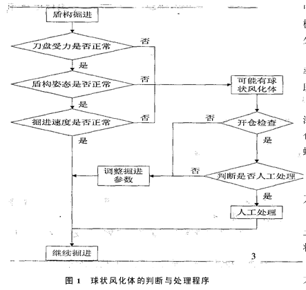 特殊地段的盾构施工技术措施摘要:盾构在地铁区间的特殊地段施工,必须作好充足的施工准备和施工技术措施。关键词:地铁区间;盾构施工;技术措施 广州西场站—西村站地铁区间施工标段,沿线两侧为密集民居、酒店、办公楼、商店等,交通繁忙,上部地面为环市西路,区间线路穿越广茂铁路,地形平坦,略有起伏,其中有岩溶和溶蚀空洞、内环高架桥桩、基岩球状风化体地段(风化深槽)、泥质粉砂岩、上软下硬岩段等特殊地段。其中广州火车站—草暖公园区间段下穿过广州火车站广场,到达草暖公园,施工难度大。根据现场实际情况,做出相应的盾构施工技术措施。1盾构通过岩溶和溶蚀空洞 本工程隧道左右线均存在岩溶和溶蚀空洞,左线溶蚀空洞约为0.8m高,右线在YCK7+522和YCK7+576处存在溶蚀空洞,其中较大的溶蚀空洞为2.7m高,对盾构掘进造成极为不利的影响,极有可能发生突泥、突水、地面沉陷、盾构机被卡等严重事故。 为保证盾构掘进顺利通过,必须提前探明隧道穿过的岩溶裂隙的位置、形状、尺寸大小、充填物性质等,并及时处理。施工采取以下措施探测和处理: (1)开工前,进行补充地质勘探,在左右线溶蚀空洞地段加密勘探,在勘探场地允许的前提下,使部分钻孔间距达到10m,进一步查明该段条件地层地质条件,对可能出现岩溶裂隙的段落、岩溶裂隙的规模、充填物等情况,提前作出盾构掘进方案。 (2)对盾构机适当改造,针对地质情况,盾构机增设超声波探测系统。盾构掘进施工时通过发射超声波,可对刀盘前方30m范围内的岩溶裂隙、砂土层中的孤石等分布情况进行探测,利用专业软件对接收到的反射波分析,即可精确查明岩溶裂隙或孤石的位置、形状、尺寸大小、充填物性质等。 (3)根据超前地质预报的资料,对分布于盾构周边的岩溶裂隙,通过地面注浆的办法进行超前注浆加固或回填。对岩溶裂隙要提前确定注浆方案,根据其位置、形状、充填物性质,确定实施超前注浆的里程位置、注浆品种及配合比、注浆压力、注浆量等参数。 (4)盾构通过岩溶空洞位置时,要制定严格的盾构施工计划和实际可行的掘进参数,调整合理的泡沫添加参数,使所注入的泡沫能在开挖面形成良好的泥膜,保持其充填物的稳定。 (5)掘进通过后,在管片背衬及时施作二次补强注浆,控制岩溶裂隙内充填物的变形,使围岩保持稳定。2 盾构通过环市内环高架桥桩基 本区间段在西村站—广州火车站段下穿内环高架桥桩基础。其中有3处4根桩基侵入隧道,需要进行桩基托换,其余桩基大多在隧道左、右线之间。盾构机通过桩基础除采取一般措施外并进行特殊处理。 (1)合理控制推进速度,保证连续均衡施工,避免较长时间的搁置; (2)严格控制出土量,防止不合理的超挖和欠挖; (3)盾构在穿越这些建(构)筑物的过程中,变化不可过大、过频,每次纵坡变化不得超过0.2%; (4)同步注浆要及时、适量,以有效控制地层沉降; (5)根据地面沉降情况,必要时可针对性地进行二次补压注浆; (6)配备必要的机动设备,一旦发生意外情况则迅速投入抢险; (7)通过预先设置的观测点对建(构)筑物进行监测,如果发现异常变形,必须立即停止施工,根据实际情况采取调整施工参数或对建(构)筑物进行适当处理。3 盾构通过球状风化体地段(风化深槽) 地质剖面图显示本区间内中风化岩层中有存在微风化的情况,强风化地层中存在部分中风化地层。详勘报告认为该岩区全、强风化带内可能还存在未被揭露的中、微风化岩球状风化体。盾构施工时要采取的主要技术措施如下: (1) 盾构进入砂岩区段后,要严格监测推进油缸和盾构机姿态的突然变化及土仓压力和出碴量的变化,如发现异常,应进入土仓进行检查,以判断是否存在球状风化体,并确定球状风化体与刀盘的位置关系。工作步骤如图1。