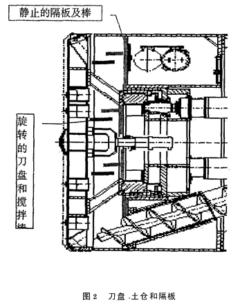 4 泥质粉砂岩段掘进 本标段从始发到吊出,中间多段穿越泥质粉砂岩。粉砂岩遇水易软化崩解。盾构掘进时可能会在刀盘特别是刀盘的中心部位产生“泥饼”,当产生泥饼时,掘进速度急剧下降,刀盘扭矩也会上升,大大降低开挖效率,甚至无法掘进。 首先,利用WIRTH-NFM盾构机具有防止泥饼产生的特点如图2所示。 (1)刀盘面板与后部土仓密封隔板共同组成土仓,隔板上的中心圆饼和周围圆环都是静止不转并设搅拌棒。掘进时,刀盘面板与隔板之间存在相对运动,搅拌棒可充分搅拌碴土,从而可减少在土仓中产生泥饼的可能。 (2)中心开口率大,且中心刀可及时更换成片式刮刀,使开口率进一步增大。中心刀盘面板和中心隔板之间存在相对运动,借助于搅拌棒充分搅拌碴土,不易产生泥饼。 (3)通过面板上的泡沫注入口,向刀盘面板和土仓中注入泡沫剂,一方面清刷刀具上糊的粘土,降低刀具温度,也可以改善土仓内的碴土性能,增加碴土的流塑性,防止形成泥饼,堵塞土仓及螺旋输送机。 其次,施工中采取以下技术措施: (1)在到达这种地层之前把刀盘上的中心滚刀更换为片式刮刀,进一步增加刀盘的开口率。 (2)加强盾构掘进时的地质预测和泥土管理,特别是在粘性土中掘进时,要更加密切注意开挖面的地质情况和刀盘的工作状态。 (3)在这种地层掘进时应适量增加泡沫的注入量和选择比较大的泡沫加入比例,减小碴土的粘附性,降低泥饼产生的机率。 (4)一旦产生泥饼,及时采取对策,必要时采用人工处理的方式清除泥饼。 (5)必要时螺旋输送机内也要加入泡沫,以增加碴土的流动性,利于碴土的排出。5 盾构在上软下硬段岩层掘进 在软岩和硬岩分界处,部分区段内坚硬岩层仅在隧道开挖面下半部分出露(半软半硬)。本区间大部分地层均上软下硬。盾构在穿越上软下硬区段时,由于上下岩层强度相差较大,盾构容易上抛,此施工段施工重点是盾构机的使用控制。 (1)适当放慢掘进速度,使盾构刀盘能对正面坚硬岩层进行充分破碎; (2)合理利用盾构铰接千斤顶,改变刀盘倾角以加强对硬岩部位的切割,提高盾构掘进过程中的轴线控制能力; (3)调整盾构机推进千斤顶的区域油压,硬岩区域推进千斤顶油压较软岩部位适当加大,以控制千斤顶的合力作用点、抵消上抛力,控制好盾构轴线位置和隧道坡度。 (4)利用刀盘边缘的扩挖刀,对下部硬岩部分适量扩挖以避免盾构上抛。 (5)如果上部太软掘进时出现塌陷,则应考虑地表注浆加固。一般情况下可以通过保持一定的土压防止上部掌子面坍塌。6 小 结 在广州,地铁施工正在大面积地推进,施工中遇到很多特殊地段,地铁施工者特别情况特别处理,做出相应的施工措施,并不断地在实践中总结经验提高施工技术水平,提高工效创优质工程,创用户放心工程。参考文献:[1] 城市快速轨道交通工程项目建设标准[S].[2] 地下铁道设计规范(GB50157-2003)[S].[3] 地下铁道工程施工及验收规范(GB50299-1999)[S].[4] 铁路隧道施工规范(TB10204-2002)[S].