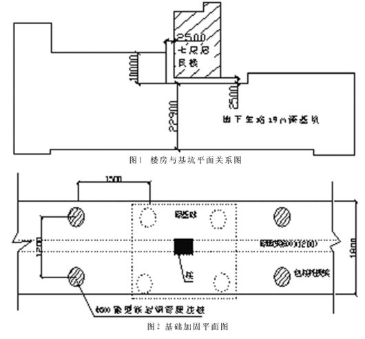 广州地铁某车站七层居民楼基础加固施工摘 要在复杂地质条件下对地铁深基坑开挖时,结合对其周边建筑物基础加固施工,介绍了楼房基础加固的方案选择、施工过程和施工工艺。关键词桩基托换;支承体系;施工监测;稳压封桩;植筋1工程概况 该楼为七层框架结构居民楼,建造于1990年,总建筑面积约4000m2,基础为φ480mm沉管灌注桩,桩长为15~18.6m不等,该楼旁为正在施工中的地铁某车站明挖深基坑,基坑长132米,宽23米,深19米,为地下连续墙加内撑支护结构,楼房距基坑2.5米,楼房与基坑平面关系图如图1所示。2地质资料 该七层楼场区内土层从上至下为: 人工填土层,厚0.60~3.90m;② 冲-洪积砂层厚0.60~3.70m;③冲-洪积土层,多可塑状,厚1.10~7.30m;④河湖相沉积土层,淤泥质土,厚0.80~8.00m;⑤坡积土层,以可塑状粉质黏土为主,厚1.00~10.00m;⑥ 花岗岩残积土层,以砂质黏性土为主,局部夹有砾质黏性土。厚2.10~14.50m,透水性较强,而富水性较弱;⑦花岗岩全~微风化带,该岩层遇水极易崩解,中等富水层,透水性一般。地下水位1.15~3.80m。3 加固理由 3.1该楼紧邻车站基坑,距地铁施工的基坑仅有2.5米,基础为摩擦桩,桩长15~18.6米,小于基坑开挖深度19m,基坑开挖不可避免地会影响楼房。 3.2在靠近该楼的车站基坑土方开挖深度达4.5米时,基坑侧移10mm,该楼基础下沉14mm,首层楼房墙体及地台出现细裂缝。 因此,提前对该楼进行加固是必要的。4加固桩型的选择 该工程选择基础托换法对楼房基础进行加固,针对普通砼钻孔桩和微型嵌岩钻孔桩桩型的选择,分析如下:4.1普通砼钻孔桩 该桩是常用的桩型,具有施工简单、造价低的优点。但用在该工程中具有以下缺点:一是该桩成孔较大,施工期间因在一定程度上降低原桩承载力,影响随成孔孔径增大而迅速增强;二是因为该场区有较厚的全风化花岗岩残积土,该土层具有遇水崩解的特点。而全风化花岗岩残积土崩解容易造成塌孔和导致桩底沉渣太厚(可达几十厘米)而削弱桩基承载力。4.2微型嵌岩钢管灌注桩 钢管桩具有桩截面小、承载力高、施工快捷的优点。该桩因成孔小,故对原桩的影响要小得多,同时因其成孔小和钢管接驳速度快(螺纹连接)而可避免塌孔的出现。针对该桩型较柔的特点,可采取预加力封桩的方法消除桩的变形。 综上所述,选取φ300微型嵌岩钢管灌注桩做为该工程的桩型。基础加固平面图和立面图如图2所示。