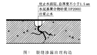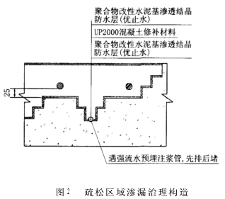 3.2疏松区域渗漏治理 疏松区域渗漏治理构造见图2。其工艺流程为:放线→彻底剔除松动混凝土(至少保障清理后的混凝土基面距锈蚀钢筋25mm)→清理清洗界面→埋注浆管引水→界面涂刷优止水→钢筋做除锈阻锈处理→UP2000结构修补剂修补→向注浆管注浆止水→表面涂刷优止水→养护。