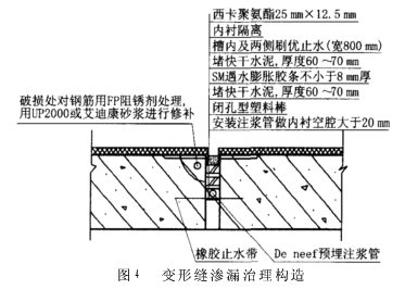 3.4变形缝渗漏治理 变形缝渗漏治理构造见图4。其工艺流程为:彻底清除原有嵌缝材料→凿除松动破损混凝土→高压水冲洗界面→(如缝口破损应对锈蚀钢筋除锈阻锈→破损面修补)→放置背衬用立止水封堵缝隙→麻丝背衬放置注浆管→再用快干水泥封堵注浆管→向注浆管注水→注浆→再注浆→再注水→沿变形缝两侧磨槽(宽400mm、深1.5mm)→用优止水涂刷2遍→槽内放置PS条→嵌入聚氨酯密封膏封缝。