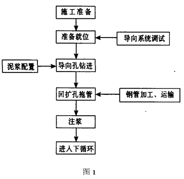 (3)施工方法。 采用水平定向钻机从东南结合部往东北结合部一次性施做导向孔,从东北往东南回扩孔拖管,钢管单节长6m,接头采用丝扣连接。为防止施工管棚串管,施工时从拱顶往下间隔施工。(4)使用设备、仪器。 超前长管棚施工主要设备、仪器:FDP-15D水平定向钻机、ECLIPSE无线导向系统和地磁地下定位系统、UB-8型砂浆泵。(5)工效。 由于蒲黄榆车站拱部超前长管棚位于交通繁忙的蒲黄榆主路下,导向孔钻进采用无线导向系统时必须在晚间23点到第二天7点之间;施工速度根据地层及管棚埋深不同施工效率不同。 当管棚埋深在10m内,采用无线导向系统时,粘土层中钻进一根管棚(L=146m)需24h左右;砂层中钻进一根管棚需33h左右。 当管棚埋深在10m以下,采用地磁地下定位系统时,管棚位于中粗砂层中,钻进一根管棚(L=146.6m)需38h左右。(6)管棚注浆。 管棚注浆设备:UB-8型砂浆泵,最大工作压力6MPa,最大排量8m3/h,最大水平输送距离250m。 注浆方向:东南车站结合部往东北车站结合部,一次性灌注。 管棚钢管浆液扩散孔布置:纵向300mm间距梅花型钻Ф10mm浆液扩散孔,环向3排。 浆液:水泥浆,外掺少量微膨胀剂,配合比水泥∶水∶膨润土∶铝粉=1∶0.8∶0.05∶0.001;注浆压力在1.5MPa左右。(7)效果。 施工管棚设计注浆数量2.9m3,实际注浆数量基本在3.5m3左右。2.3超前导管施工 超前小导管设置在车站、风道、区间、出入口通道拱部,区间拱部超前小导管单根长L=3m,其余拱部超前小导管单根长L=2.5m。(1)工艺流程(见图2)。