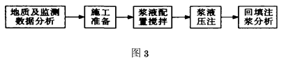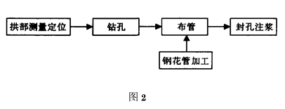 首先按设计测量定位,然后采用煤电钻孔,成孔检查后采用风钻顶进钢管,喷射5cm厚混凝土封闭掌子面,最后进行浆液压注。(2)使用设备。 钻孔采用煤电钻或气动风镐、吹管(自制25mm钢管),注浆采用UB-8型砂浆泵及KBY-50/70双液注浆泵。(3)工效。 车站2.5m长小导管施工一根需6min,区间3m长小导管施工需7min。 压注一根小导管需6min。(4)管的布设参数。 车站超前小导管沿起拱线上按0.3m间距环向布置,每环104根;纵向每两榀钢架布设一排,即每排小导管纵向间距1m。 风道、出入口、通道沿拱部120°范围环向按0.3m间距布置,风道拱部每环43根,结合部每环37根,纵向每两榀钢架布设一排,即每排小导管纵向间距1m。 区间在拱部环向按0.3m间距布置,每环25根,纵向每两榀钢架布设一排,即每排小导管纵向间距1.5m。小导管采用Ф32×3.25mm钢管,钢管上纵向孔眼间距15cm,孔眼直径8mm,顶部制作成锥型,尾部焊箍;上仰角控制在7°~10°。(5)小导管注浆。 区间砂层压注化学浆液,配合比:稀硫酸∶水玻璃=1∶6~8。 车站水泥砂浆配合比:水泥∶砂∶水=1∶0.5∶0.7。车站水泥~水玻璃双液浆∶水泥浆水灰比1.25∶1~0.5∶1,水玻璃模数2.4~2.8,水玻璃浓度使用范围30~45,水泥∶水玻璃=1∶1(体积比)。注浆压力:0.5~0.8MPa。(6) 注浆效果。 拱部小导管注浆完成后,在拱部形成一个固结保护层,延长围岩自稳时间。保证下一循环开挖支护施工过程中不出现坍塌,使围岩自稳时间在4h以上。 地面注浆起到填充加固地层不密实土体的作用,对掌子面封闭注浆起到加固围岩的作用,保证在开挖时不发生坍塌,延长围岩自稳能力。2.4拱背回填注浆 拱背回填注浆主要对初期支护背后土体进行回填加固;回填注浆管采用Ф32×3.25mm钢管。在距开挖封闭成环掌子面3m后进行拱背回填注浆。(1)工艺流程(见图3)。
