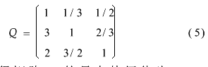 4.3确定各因素权重 为确定三个指标因素的权重,先模拟打分并按层次分析法建立反映它们之间相对重要性的正互反矩阵Q如下: