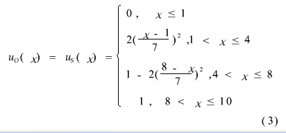 4.2 选定各失效分析指标的隶属函数4.2.1 失效发生频率程度的隶属函数 根据表1,当失效发生频率程度不大于1时,可以看成失效可能性等级很小;当失效发生频率程度大于8时,可以看成失效可能性等级达到最高。由此特点,本文将其隶属函数uO(χ)取为: