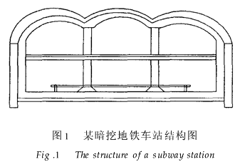 它是单因素ui在总评价中影响程度的一种度量。A中的分向量称为因素ui的重要程度系数,或称权重。 目前有多种方法用于确定权重值。为获得合理的结果,本文后续算例将先模拟专家打分,然后采用求层次分析法(AHP)中正互反矩阵特征向量的方法来确定权值。3.4综合评价 在确定了模糊矩阵R和模糊向量A后,可作如下模糊变换来进行综合评判:B=AR={b1 b2 … bn} (2) 式中B称为输出模糊向量,bj= ∑akrkj,j=1,2,…,n。由此得到评价集V的模糊子集,即输出模糊向量B,其分向量的数值大小将相对地反映了在地下工程施工中有关因素的风险程度。4工程应用算例 某暗挖地铁车站[3]是双层三跨二柱连拱结构(如图1)。施工方法采用先修两边跨,后修中跨的方案,施工中在拱部、立柱、地基等处。在施工中,有可能出现开裂,下沉、防水层失效等风险。对该地铁车站施工中的潜在风险,文献[3]已按风险乘数法做过分析,本文在此拟采用其基本资料按上述模糊综合评判法进行评估和比较。
