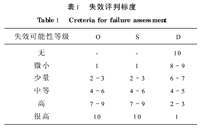 4.1选定失效分析指标 在施工风险分析时,要考虑工程系统中存在哪些隐患,并确定其失效模式,进行失效机理分析。为此,本文设定三个指标加以表征,即失效发生频率的程度(O)、失效后果的严重程度(S)、失效原因被检查出的程度(D)。根据以往经验与所考察对象相似的系统失效记录[3],用1到10数字来标识失效评判指标(表1),该工程失效模式、机理和后果以及量化指标打分结果等见表2。