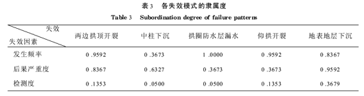 5结束语 本文初步研究表明,模糊综合评判法可用于地铁车站工程施工中的风险分析。对地下工程施工这一本身带有不确定性的复杂系统,这种分析可以在一定程度上加深对可能失效事件的认识,并通过采取合理的措施而尽可能地将风险或失效降低到最小的程度。本文研究的算例只是抽取影响地铁车站施工过程中可能出现的5种失效模式和三个主要的量化评估指标进行了模糊综合分析。事实上,地铁车站施工过程的风险会来源于方方面面,还可能有影响风险的一些偶然因素未被考虑进去。因此,在实际应用中,应针对具体工程情况适当地选取因素集和权重,同时参加基本失效因素评价的人员最好是该行业具有实际工程经验的专家,评价人数不能太少且应具有代表性。参考文献:[1] 陶龙光,巴肇伦.城市地下工程[M].北京:科学出版社,2002[2] 张庆贺,朱合华,庄荣等.地铁与轻轨[M].北京:人民交通出版社,2002[3] 张国亮,张振刚.地下工程施工中的风险分析[J]. 西部探矿工程,2005,(3):214-216[4] 张树义,白继承.铁路隧道施工人员伤亡事故树分析[J].世界隧道,2000,(3):57-61[5] 冯保成.模糊数学实用集粹[M].北京:中国建筑工业出版社,1991[6] 许传文,任青文.地下工程围岩稳定性的模糊综合评价[J].岩石力学与工程学报,2004,23(11):1852-1855[7] KandelA,ByattWJ.Fuzzyprocesses[J].FuzzySetsandSystems,1980,4(2):117-152[8] ShaoRQ.Amulti-levelfuzzysyntheticevaluationonin vestmentprogramsinshipping[J].TransportationEngineer ing,2004,144(93):497-502[9] 狄建华.模糊数学理论在建筑安全综合评价中的应用[J].华南理工大学学报(自然科学版),2002,33(7):87-91[10] 余琼芳,陈迎松.模糊数学中隶属函数的构造策略[J].漯河职业技术学院学报,2003,2(1):12-15