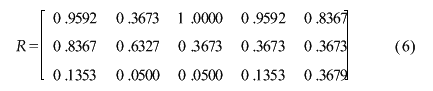 容易求得矩阵Q的最大特征值为λmax=3.0735。根据层次分析理论,与Q矩阵阶数m=3对应的随机一致性指标RI=0.58,而一致性指标CI=(λmax-m)/(m-1),于是有CR=CI/RI=0.06<0.1。可见,Q矩阵通过了一致性检验而可以被后续的分析采用。 正互反矩阵Q与λmax对应的特征向量α={0.2762 0.6323 0.7238}。对它进行归一化并用于确定各评价因素的权重,即取输入模糊向量矩阵A={0.1692 0.3874 0.4413}。4.4计算各失效模式的隶属度 将表2中的O、S和D数值代入隶属函数式(3)或式(4),所得隶属度列入表3。这样失效模式的模糊关系矩阵为: