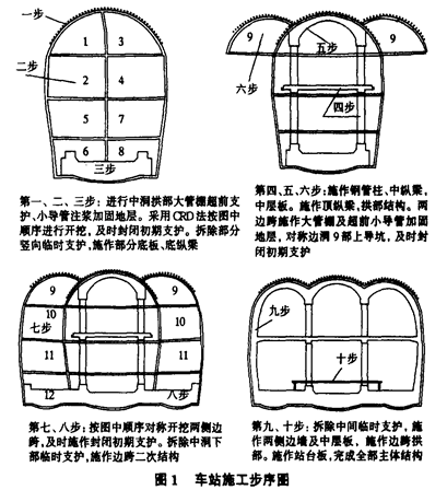 2.2 砂层开挖支护方法2.2.1超前支护 为保证开挖中的安全,控制砂层坍塌,保护地下管线设施,采用大、小管棚进行超前支护。 大管棚做法:管棚采用直径108mm、壁厚5mm的无缝钢管,管棚长18m,搭接3m,管身上钻6mm~8mm的孔,梅花形布置,孔距30cm。注浆选用水泥砂浆,浆液配比1∶1∶1,注浆压力0.2MPa~0.3MPa。 小导管施作方法:由于拱部土体大部分为粉细砂层,小导管采用特殊制作。先按常规做好注浆管,导管采用?32mm水煤气管制成,先将钢管截成长2.0m,一端做成尖锥形,另一端焊上?6mm钢筋制成的箍。在距头部1.0m~1.5m以下每隔8cm,交叉钻?5mm~?8mm的孔。导管做成后,每个孔眼进行特殊处理,在孔眼位置扩孔5mm,深2mm,安设封孔片,防止在导管打入的过程中粉细砂堵塞孔口。 注浆时,在注浆的压力下,浆液冲开封片,使浆液能注入粉细砂层中。小导管注浆采用“注浆一段,开挖一段,段段推进”方式,导管间距33.3cm,小导管长2.0m,搭接1.5m,外插角10°~15°。注浆材料选用改性水玻璃浆,水玻璃浓度一般为35Be′,模数2.75~3.05,pH=2~4。2.2.2 洞室开挖1)1,3,9部洞室开挖支护。 粉细砂虽较密实,但稳定性差,掌子面易失稳坍落,开挖不合理则会造成大面积塌方。施工中采用上下两步台阶开挖,上台阶高度1.8m。根据早成环的原则,同时保证掌子面稳定和施工安全,施工中台阶长度控制在2m~3m,格栅支立好后及时加设水平工字钢。上台阶预留核心土,核心土长度0.8m~1.0m,坡度1/3左右。下台阶土体保证1∶6左右坡度。轮廓拱腰处开挖时基面轮廓为倒坡形式,下台阶施工时先掏槽开挖,支护该处侧墙,避免塌方,保证施工安全。最后再开挖剩余土体、支护成环。2)2,4,10部洞室开挖支护。 车站2,4,10部洞室大部分位于细砂、中粗砂层上,砂层在降水后变得非常松散,稳定性更差,施工中先对该地层进行侧向注浆加固然后再掏槽开挖。导管采用Φ32mm水煤气管制成,钢管长1.8m,在距头部1.0m以下每隔15cm交叉钻Φ8mm的孔,导管间距50cm,外插角20°~30°,与锁脚锚杆交错设置。注浆材料选用水泥浆或水泥水玻璃浆,水泥浆液配比采用1∶1。双浆液水玻璃浓度一般为35Be′,模数2.75~3.05,水泥浆为1∶1,水泥浆与水玻璃浆液配比也为1∶1,施工中采用了以上两种浆液,水泥浆对无水地段效果较理想,双浆液对残余水部位堵水效果较好。由于砂层较为松散,注浆压力在0.3MPa~0.5MPa之间。3)回填注浆。 车站开挖后,立即喷射混凝土作为初期支护,但由于施工工艺和喷射混凝土自重等原因,往往在初期支护和砂层间存在空隙。为了消除空隙引起的地表沉降,施工中在喷射混凝土时预先埋设注浆钢管,钢管长70cm,间隔10cm打设花眼,用胶带封口,埋入砂层30cm。埋设部位在拱顶、拱腰、拱脚、墙中等处。待喷射混凝土达到一定强度后,向预埋管内充填水泥砂浆或水泥水玻璃浆,进行全断面周边注浆。 车站洞顶部纵向每3m布设一根注浆管,环向4m布设一根,开挖3m~4m后进行回填注浆,注浆机械选用低压注浆泵,注浆压力控制在0.1MPa~0.2MPa。注浆材料为水泥浆,孔隙较大部位注水泥砂浆,注浆顺序由上向下逐次进行。3 施工技术的改进3.1大管棚施工 在浅埋暗挖工法中,地面有建筑物,地下有各种管线等设施,采用大管棚超前支护对保护既有建筑物、控制地表下沉有较好的效果。 本站采用18m长管棚,直径108mm,搭接长度3m,每隔15m就要重新打设下一环。目前国内外的机械一般施作高度在60cm~80cm,考虑管棚长度和机械摆放,需要施作6m长的工作室。施作工作室时,需向上挑高,以15°角计算,挑高60cm长度为2.3m。砂层地区上挑开挖难度非常大,由于小导管仰角已经大于15°,支护能力明显降低。 由于施工中不断变化格栅形式,超挖部分需用二衬混凝土回填,造成很大的人力、材料的浪费,且耗时长。开辟工作室同时造成初支背后很多转折点,一方面极易形成积水槽,给结构耐久性带来一定的影响,另一方面初支表面转折点变化多,给防水层施作带来诸多不利因素。 目前,国内多采用直径150mm长管棚,施作30m~60m长管棚已有很多成功经验,施作150m亦有成功经验。因此,在今后的设计和施工中,应尽量采用60m左右长大管棚,减少工作室的施作。3.2粉细砂地层加固 粉细砂土层一般较为密实,但自稳能力差,无法形成自然应力拱,易产生大面积坍塌,在有水的情况下更易产生流砂现象,是施工开挖支护控制的难点。对于本站粉细砂层的开挖,施工中为了保护环境,未采用有毒的化学浆液,只采取了预注酸性水玻璃加固土层的方法。将水玻璃稀释15Be′,加10%~20%的稀硫酸,同时加微量碳酸钠,pH值控制在3左右。 施工前期注浆压力采用0.3MPa~0.5MPa,固砂效果不理想,固砂体单轴抗压强度达到0.15MPa。 在后期的施工中,工作面施作了30cm~40cm厚的止浆墙,将注浆压力提高到0.8MPa,通过效果检查,固砂体单轴抗压强度达到0.5MPa,基本满足开挖要求,但施工中砂层剥落至小导管现象时有发生,小导管起到了一定的支护作用。因小导管注浆每隔1m就要施作一环,工作面还需施作较厚止浆墙,注浆结束后还得凿除,严重制约了工程进度。 随着长管棚技术的发展,一次施作较厚止浆墙,提高注浆压力,改善浆液配比,粉细砂层加固难点将得到较好的解决。