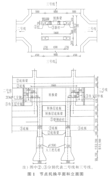 地铁车站结构转换中的已有结构物变形控制技术摘要:介绍广州市轨道交通三号线客村站转换层结构转换施工中控制已有结构变形的技术措施,说明在结构转换中变形控制是整个结构托换中的关键问题。关键词:转换层;结构转换;变形控制1前言 城市轨道交通因具有运量大、快速、正点、低能耗、少污染、乘坐舒适方便等优点,被称为“绿色交通”,但城市轨道交通只有在形成基本网络的情况下才能充分发挥其应有的功效。因此在路网的交叉点和各线路车站之间必须设置相互联通的换乘设施,这种相互连通的换乘设施就是所谓的转换层。通常情况下转换层是在前一条线路施工时就一起施工完成并预留了与交叉路网的接口部分,但如果受线路总体调整和周边环境的限制,将可能导致转换层的重新施作,而重新施作转换层中往往需首先进行荷载转移,也称为结构转换,必须解决承载力和变形控制两方面的问题,而变形控制尤为关键。本文通过广州市轨道交通三号线客村站转换层结构转换中变形控制实例,阐述变形控制在整个结构托换中的若干关键问题。2工程概况 广州市轨道交通三号线客村站是广州市轨道交通网中二号线与三号线的换乘车站,设计为地下4层车站,总体呈南北走向,与轨道交通二号线客村站呈十字交叉状。二号线客村站为地下2层车站,施工时在车站结构以下部位预留了与三号线的换乘转换平台(原转换层),长18m,宽19.1m,净高4.1m,底板厚1.2m,底纵梁下翻1.4m。 受车站型式布置的影响,为使二、三号线换乘客流顺畅,三号线施工时要将已施工的二、三号线原转换层底板全部凿除,重新施作二、三号线换乘转换平台(位于三号线负3层位置)。又由于三号线线路的调整和车站站台的控制,造成二号线在节点段的中柱与三号线的中柱发生错位(两柱中心相距1.25m);为了将二号线中柱的荷载转移到三号线中柱上,必须在现二、三号线转换层进行荷载转移(结构转换),在结构转换完成后,重新施作新的转换层。本工程的特点是施工场地狭小,材料运输困难,工期紧,对既有的二号线变形控制要求相当高。3结构转换形式的确定 结构转换形式通常有板式、梁板式、梁式、拱式、桁架式等,其中梁式转换结构具有结构合理、受力明确、可靠、造价较低、布置灵活、施工方便等优点,可以通过结构柱在柱上设置大梁直接进行结构托换,且在托换结构体系完工后进行原柱与底板的分离也较方便,易于施工,符合本工程的施工条件,因此本工程结构转换选择梁式转换结构。为保证承载力的要求,桩型采用质量较有保证的人工挖孔桩,桩身采用钢筋混凝土型钢柱。 整个结构托换的主要施工工序为:首先在三号线新柱位进行人工挖孔桩及三号线型钢柱的施工,再在型钢柱进行转换大梁施工,最后截断节点段中柱,将二号线中柱荷载通过转换大梁转移到三号线中柱上。人工挖孔桩进入三号线底板以下8.1m(中风化岩)或9.6m(强风化岩)处,在转换层底板和转换层底纵梁以上采用边长1.0m的方桩,在转换层底板和转换层底纵梁附近扩大为f1.5m圆孔,在端头附近扩大为f3.0m圆孔。型钢柱采用2I50C工字钢,混凝土强度等级为C45;转换大梁长度为10.6m,结构采取变截面,尺寸为(1200~1400)×3000,转换梁与老柱采用植筋、齿槽和粘结剂并以水平预应力索箍抱紧进行连接。节点托换施工图如图1所示。