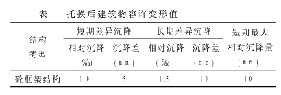 4施工中的变形控制技术措施 对已建建筑物进行基础托换和转换层施工时,上部结构将产生一定程度的不均匀沉降,又由于钢筋混凝土结构在长期荷载作用下具有徐变性,托换结构既要考虑原建筑物荷载转移到托换结构阶段产生的短期变形,又必须考虑托换完成后使用阶段的长期变形,因此整个托换结构的施工重点在于被托换工程建筑物的沉降变形控制方面。托换后的建筑物沉降变形容许值见表1。