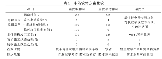 深圳地铁科学馆车站的设计与施工技术[摘要]阐述和比较了地铁车站采用盖挖顺作、盖挖逆作和暗挖法的技术特点,阐明了深圳地铁科学馆站采用盖挖顺作法施工的关键技术,并对一种新型临时路面系统的设计与施工进行了详细的介绍。[关键词]地铁车站;盖挖顺作法;路面系统 科学馆站位于深圳市上步路与松岭路之间、深南中路行车道下方,全长222.5m,为10m岛式站台,双层双跨(局部3跨)钢筋混凝土框架结构。深南中路为深圳市东西向市区主干道,道路总宽度50m,机动车道为8车道,宽28.5m。道路两侧为大片绿化地和停车场,建筑物相距100m。本标段范围内地面已开辟为商业区,地形平坦开阔,地面标高在3.4~11m,附近有深圳市委等重要部门和高层建筑。此外,地下管线种类繁多,所处位置错综复杂。 工程区域属海冲积平原和台地,地表覆第四系全新人工堆积层,海积冲积层及第四系中更新统残积层,下伏燕山期花岗岩层。工程范围内,地下水按赋存介质分为第四系孔隙潜水和基岩裂隙水。地下水埋深2.2~5.1m,水位变幅0.5~1.0m,车站范围内无砂层,粘性土层具弱透水性。1车站设计方案比选 科学馆站初步设计方案有3种:①暗挖法;②盖挖半逆作法;③盖挖顺作法。 暗挖法施工主要工序为:工序1 人工开挖导洞并支护后,在洞内开挖中桩和侧墙围护桩,浇注底纵梁、中柱、顶纵梁,灌注侧墙围护桩及桩顶纵梁。工序2 施作拱顶超前短管棚,锚喷支护,完成拱部初期支护;开挖下半断面至中板面;安装第1道钢支撑,施工中板侧墙锚喷支护。工序3 开挖至基坑底,施作侧墙及基底垫层,由下至上铺设防水层,模筑框架结构,拆钢支撑。 盖挖半逆作法施工主要工序为:工序1 施工一侧人工挖孔桩,再施工中间临时立柱,开挖基坑至顶板底面,浇注半幅顶板后,恢复路面。工序2 施工另一侧人工挖孔桩,开挖基坑至顶板底面,浇注半幅顶板后,恢复路面。在顶板下开挖基坑土方,采用顺筑法施工底板、侧墙、中板。3种工法的技术特点比较如表1所示。