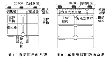 从上面分析可见,盖挖顺作法对地面交通影响不大,工期较短,能保证主体结构防水质量、减小管线迁移,施工安全度比暗挖法有较大提高,防水效果好,成本较省。最后确定车站采用盖挖顺作法施工。2 车站临时路面系统的设计与施工2.1车站临时路面系统的优化 科学馆站临时路面系统原设计如图1所示。经过比较论证,临时路面系统变更采用20m跨六四式加强型军用简支梁,如图2所示。2.2车站军用梁临时路面系统的设计 六四加强型军用梁在基坑上横向布置,作为基坑临时路面梁,间距2m,跨径20m,共计111片,军用梁如图3所示。军用梁之间于两端和中部设置纵向联结系梁,另设置纵向斜杆联结系梁,以加强主梁整体稳定和沿基坑纵向的刚度。除中部纵向联结系梁为适应本设计而作的特别设计外,其余纵向联结构件均为军用梁系列定型产品。路面板两端搁置在军用梁上弦杆上缘上,采用U形螺栓压板联结,军用梁下弦杆端部与冠梁顶紧,作为基坑围护的第1道支撑,如图4所示。