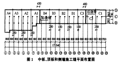 浅谈大体积混凝土施工缝的设置摘 要:根据地铁三号线岗顶站土建工程的施工实例,介绍了施工缝的设置原则及方法,阐述了施工缝的处理方法及施工中的注意事项,施工结果显示其效果良好,总结了后浇带、施工缝分段法浇筑的施工经验。关键词:大体积混凝土,施工缝,主体结构,后浇带1工程背景 由广州第二市政工程有限公司承建的地铁三号线岗顶站土建工程,车站结构呈“7”字状,车站全长为176.4m,西侧宽约28m,东侧宽约18.5m,车站主体结构高度为12.8m。车站底板厚90cm,站厅板(中板)厚40cm,顶板厚80cm,侧墙厚60cm。底板、侧墙、顶板结构采用C30防水混凝土,抗渗标号为S8,其余结构采用C30普通混凝土。本工程结构以现浇混凝土为主,且现浇混凝土体积庞大,工程实践证明,大体积混凝土施工难度比较大,混凝土产生裂缝的几率较大,稍有差错,将会造成无法估量的损失。 合理的设置施工缝,配合适当的养护措施,能有效的抑制大体积混凝土温度裂缝和沉缩裂缝的产生和发展。为了确保混凝土浇筑的质量与避免出现施工高峰,该公司采取后浇带、施工缝分段法对主体部分进行施工,有效地防止混凝土浇筑后产生干缩现象影响结构。2施工缝的设置 施工缝的设置要综合考虑以下原则:1)施工缝应留在结构剪力较小的部位;2)施工缝一般应垂直于结构的纵轴线;3)施工缝应避开结构的薄弱环节;4)施工缝的设置应考虑施工简便易行。结合本工程结构特点,纵向施工段长度控制在13m左右,设两道1m宽的后浇带,竖向根据主体结构,分层施工。2.1主体结构竖向施工缝 本工程结构纵向共分11个施工节段,在8轴及18轴附近设两条后浇带。其施工顺序先做C区,再做B区,最后做A区,按从东到西分段施工,施工缝布置见图1,图2。