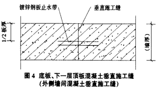 3 处理方法及施工注意事项3.1 施工缝处理方法1)无防水要求的施工缝处理: 部位:主要指中板梁、板、内墙和内柱施工缝。 处理方法:旧混凝土接触处,彻底清除施工缝处残渣,并用压力水冲洗干净,充分湿润,残留在混凝土表面的积水予以清除;钢筋上的油污、水泥砂浆及浮锈等清除;在浇筑混凝土前,先在施工缝面涂刷专用混凝土界面剂。2)有防水要求的施工缝处理方法: 部位:底板、顶板和外墙施工缝。 处理方法:同无防水要求的施工缝处理方法,另在施工缝处增设止水带,止水带采用镀锌钢板止水带,做法如图4所示。