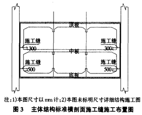 2.2主体结构水平施工缝 按由下到上的施工顺序,主体结构竖向分三层:第一层为结构底板及其底上50cm侧墙、第二层为站台层侧墙和中板、第三层为站厅层侧墙和顶板,站台下排热风道及轨顶风道在主体结构完全采用二次混凝土浇筑。施工缝布置见图3。