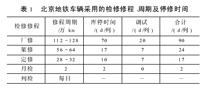 预防性计划修是将日常维修列检和根据车辆制造商确定的定期检修相结合,定期检修修程一般分为厂修、架修、定修、月检。该检修制度下,将列车集中进行全面检查,车辆一到各种修程,特别是厂修、架修,不论车辆的实际使用时间、质量状况如何,都需按其检修修程的内容进行全部作业,在一定程度上造成车辆、材料、人工的浪费。 均衡修是利用列车运行停运窗口时间将其检查内容分散在几个时段及不同场合进行,通常用于运用维修,如港铁模式中的A、B列检。其较高修程的架修等采用定期检修,实现大部件完全互换修,将架修内的不同大部件检修根据其大部件个体的检修周期安排在A、B列检或架修时分解,这样可以实现不同部件不同步作业,避免车辆、材料、人工的浪费。 目前,北京、上海、广州等城市的轨道交通车辆的检修也在逐步向均衡修过渡。因此,对于北京地铁4号线车辆基地由有着成熟均衡修经验的港铁运营,同时为促进内地检修制度的进步,完全可以采用港铁提出的检修修程、周期及停修时间。2对配属车辆及车辆段规模的影响对比分析 配属车数(NP)=运用车数(NY)+备用车数(NB)+检修车数(NJ),其中决定配属车数的主要因素是运用车数,一般占配属车数的90%左右,而备用车与检修车所占比例有限,因此其影响投资不是很大。 就北京地铁4号线而言,在相同客流、运行交路的前提下,运用车数相同。根据港铁和北京原采用的检修修程、周期及停修时间计算的设计近期检修车数分别为1列和3列。如果取相同的备用车系数,则备用车也相同。因此,可以看出车辆检修修程、周期及停修时间对检修车影响较大,但由于检修车在配属车中所占比例不大,故对配属车辆影响不大,因此对车辆的总投资影响也不大。 车辆段的规模取决于运用车及备用车的停放及检修车的检修工作量。根据上述分析,就北京地铁4号线而言不同检修模式下运用车、备用车相同则停放规模相同;根据港铁要求采用的检修修程、周期及停修时间计算的设计远期厂、架修规模为2列位,根据北京原采用的检修修程、周期及停修时间计算的架、定修规模各为1列位(厂修送北京地铁车辆厂),同时都考虑临修1列位,则定期检修的规模相同,均为3列位。对运用检修,按原检修模式设计需月检3列位、静调1列位;按港铁模式A、B列检需要3列位,架修、临修车的静调2列位,车辆的简单故障修复需要2列位。可见其规模也没有减小。 由上述分析可知,不同检修模式对车辆配属及车辆段规模影响均不大,按港铁检修模式设计的车辆段不仅同样能适应内地的检修模式,而且由于其采用较为先进的检修模式,在保证运营安全的前提下,既减少了在修车数量,又提高了车辆利用率。3检修修程内容对比分析 不同检修模式下的检修修程内容有一定的差别,目前北京、上海等城市采用的检修修程内容基本相同,见表5。