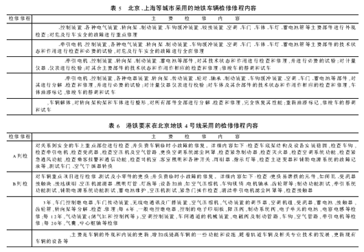 港铁要求在北京地铁4号线车辆基地采用的检修修程内容见表6。 从以上表中内容分析,检修模式不同所对应的修程主要检修内容及作业范围区别较大。其中,港铁要求在北京地铁4号线采用三线维修。 第一线维修:低级修程(A、B列检),主要是功能检查,包括设备状况检查、安全关键项目的检修,重点项目的检修、测试,小零件的更换、静动态调试和保洁工作等。 第二线维修:高级修程(架修及厂修),主要检修范围包括车顶、驾驶室各部设备,车内装外饰,制动及风源系统,车载的主要设备的检修和测试;拆卸和安装需要大修的部件及列车大修后的验收和测试。 第三线维修:车辆部件的维修。对由第二线维修工作人员拆下来的部件进行维护和修理。部件主要包括车钩、贯通道、转向架装置、轮对、制动系统、空调机组、牵引电机、蓄电池、气动和电子元件等。可见,其架修根据车辆各组成部件的寿命不同,分时段安排维修,采用完全的互换修,同时运用维修采用均衡修,大大缩短车辆检修时间,提高车辆的利用率。 而北京、上海等城市原采用的检修修程内容中, 厂、架修中未按部件寿命维修,造成大拆大卸,而月检和定修没有采用均衡修,实行列车的每日列检,造成车辆待修时间的延长,从而造成检修成本的浪费和降低车辆的利用率。4结论 随着新技术、新材料的使用,以及车辆制造技术、监控手段和检修水平的提高,实现均衡修,采用完全的互换修,最终实现状态修,是车辆检修发展的必然之路。因此,在由香港地铁特许经营的北京地铁4号线中,车辆检修采用其相对先进的检修模式设计是可行的,符合城市轨道交通车辆检修发展的趋势。参考文献:[1]GB50157—2003,地铁设计规范[S].[2]温 清.关于地铁车辆检修制度[J].城市轨道交通研究,2004(4).[3]DGJ08—109—2004 J10325—2004,(上海)城市轨道交通设计规范[S].[4]何宗华.城市轨道交通工程设计指南[M].北京:中国建筑工业出版社,1996.