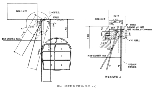 3 沉降控制方案3.1地表加固方案 考虑到风道边线距离楼房基础仅为1.3m,作业场地狭窄,在方案制订过程中既要保证能够实现楼房控制沉降目的,也要保证加固措施结构不能侵入风道开挖净空内,同时应减少对楼房周围土体的扰动。通过方案比选决定采取沿楼房北侧、风道开挖边线外侧施作树根桩方案,具体施工参数如下: 1)用钻机钻Φ130孔,埋设直径Φ108、壁厚5mm的无缝钢管,树根桩由1排竖直桩,2排斜桩组成,沿楼边纵向间距为0.5m,呈梅花形布置,横向间距0.3m。竖直桩长度为25m,伸入风道底板3m,斜桩斜插角度为分别为15°、30°,长度分别为17m、20m(见图4),钻孔顺序为先转奇数孔,注浆后再钻偶数孔。 2)在树根桩顶部沿二层楼基础施作厚0.8m、宽1.0m的C20混凝土纵梁(东西向)。为了保证树根桩与既有二层楼条基连接形成整体扩大基础,决定对楼房基础采取植筋技术,沿南北向植入Φ22钢筋,间距100mm,上下两排,并与混凝土纵梁中钢筋连接以形成整体受力结构(见图4)。