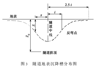 2.2 沉降量分析 按设计要求风道中线位置地表最大允许沉降值为50mm,根据地表沉降槽变化曲线(见图3),计算楼房北侧墙和中心位置的不均匀沉降值S:S=Smaxexp(-x2 (2i2)) 式中的Smax为隧道中线处最大沉降量;i为隧道中线到沉降曲线反弯点的距离,在砂层i=9.32-0.21Z0(式中Z0为地表到隧道拱顶的距离);沉降槽宽度为5i;x为距隧道中心线的水平距离。 因此,Z0=7.5m时,沉降槽宽度为39m,楼房在沉降槽影响区内;当Smax=50mm时,取x1=7.1m(北侧墙体处)时,计算得出S1=19.0mm;取x2=13.2m(楼房中心处)时,计算得出S2=1.8mm。 从上述计算结果得出,楼房北侧墙不均匀沉降差值为S1-S2=17.2mm,则相对于楼房中心的差异沉降为0.003>0.002(规范允许值),楼房基础将会出现开裂破坏。在施工过程中,当地表沉降值Smax>50mm时,楼房产生的不均匀沉降差异值将会增大。因此,为避免楼房结构出现变形开裂,影响使用安全,需采取加固措施控制因地表沉降变形而造成的楼房不均匀沉降。