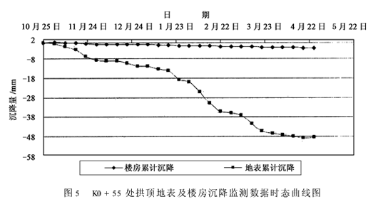 3)树根桩内注入水泥浆,水灰比为(0.6∶1)~(0.4∶1),浆液先稀后稠,根据注浆量和注浆压力调整水灰比。注浆时为保证浆液扩散效果,要求间隔注浆,同时采取反向注浆措施,即用与钢管桩同等长度的PVC管插入桩底,使浆液从底部向上升起,利用浆液水头压力达到止浆目的。3.2 其他加固措施 1)风道开挖严格按设计步序开挖,缩短开挖支护循环时间,及时封闭仰拱,严格遵守“管超前,严注浆,紧支护,快封闭,勤量测”的原则。 2)调整超前支护参数,即加密原设计超前导管,环向间距由0.3m改为0.2m,每根管长1.5m,每榀格栅施作一环,注现场调配的改性水玻璃加固砂层,控制超挖和坍塌。 3)及时对初支背后空洞进行填充回填注浆,保证初支背后密实,减少因土体损失而造成的沉降。4 实施效果 施工过程中的监控量测显示,设于拱顶正上方地表监控量测点最大累计沉降值为48.55mm,随各部开挖地表沉降状况见图5;而设于楼房北侧墙体上的监控量测点的最大累计沉降值为2.56mm(含测量误差),远小于理论计算值19.0mm,楼房处于稳定状态,且墙体没有裂纹现象发生。说明通过树根桩的施作,有效地阻止了不均匀沉降槽向楼房基础范围内的发展,达到了控制楼房不均匀沉降的目的,保证了楼房的使用安全。同时通过开挖揭示,靠楼房侧开挖断面边墙位置土体内可见浆脉发育,地层得到了有效加固,保证了开挖安全。5 结语 1)通过地表树根桩的施作,具有加固范围大、施工方便、经济实用的特点。一方面通过注浆加固了楼房基础土体,提高了基础土体的整体稳定性;另一方面通过向楼房基础内的植筋,使楼房基础与树根桩、纵梁形成了有效的扩大基础,对控制楼房沉降起到很好的作用,同时通过树根桩自身的刚度,有效地阻止楼房基础下土体受开挖扰动所产生的倾覆变形,切断了沉降槽向楼房基础范围内的发展。 2)通过采取此方法对楼房区域地层进行加固处理,有效地控制了楼房的沉降变形,实现了软弱地层中,浅埋暗挖大断面隧道成功通过楼房区,为地铁后续施工顺利进行和保证楼房安全创造了有利条件,为类似工程施工提供了借鉴。