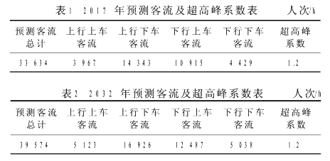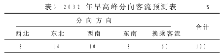 2032年早高峰分向客流预测见表3。由表2、表3可见,早高峰设计客流量为39574×1.2=47489人次/h,换乘客流占正常客流量的60%,即2.85万人次/h。1.2换乘方式研究1.2.1平面换乘方式的选择在线路可行和运营功能合理的前提下,采用排除法,对五种方式的换乘进行综合分析。“T”、“L”换乘方案,换乘客流行走距离远,换乘点少,且与正常上、下车客流有冲突;通道换乘方案,换乘客流行走距离偏远,投资偏大;同平面换乘方案,由于线路路网的不可实施性,不可能采用;“+”换乘方式,因具有换乘客流分布均匀,换乘距离短,工程投资少等特点而被采用。1.2.2竖向换乘方式研究 由于地铁一号线站厅规模偏小,也未按“+”方式预留与轨道交通三号线的连接条件,仅在车站站厅层的南侧预留接口,因此,希望通过三号线车站的修建,改善一号线站厅的局促局面,并方便各方向乘客换乘。按尽量减小对地铁一号线影响,合理利用车站南侧的预留接口的思路提出四个方案进行比较。1)方案一。上13m、下8m重叠双岛地下四层结构方案,见图1。