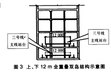 三号线主、支线车站均埋置于体育西路下,呈南北走向,主、支线平行等高,为地下三层车站,可实现站台与站台、站厅与站厅的平行换乘。三号线的主、支线均为宽8m无柱的岛式站台,车站长为331.2m,净宽31.9m,轨面埋深约20.65m。方案二具有以下特点: (1)换乘功能好。三线间的换乘功能优良,三号线主、支线可分别与一号线之间设宽度为4.5m的换乘通道,从一号线底板进入站台层,实现每两条线之间站台与站台的换乘。换乘能力可达2.9万人/h,在高峰时段还可通过站厅层实现三线之间的换乘,换乘能力尚有较大发展空间。 (2)车站埋深浅。乘客进出车站方便、快捷,节省工程费用和运营费用。但两站台间的反向客流换乘不方便。3)方案三。上、下12m全重叠双岛结构方案,见图3。