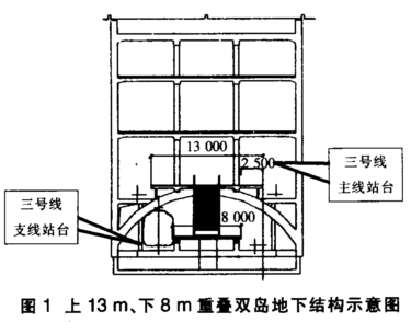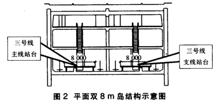 地下一层为一号线、三号线的共用站厅层;地下二层为一号线的站台层,三号线的设备层;地下三层为三号线主线站台层,站台为13m宽双柱岛式站台;地下四层为三号线的支线站台层,站台为8m宽无柱岛式站台。可实现站台与站台的直接换乘及站厅的换乘。车站全长279.2m,宽23.9m,主线轨面埋深约20.65m,支线轨面埋深约26.65m。方案一具有以下特点: (1)换乘功能最好,可通过站台直接换乘,以最快捷、方便的换乘方式解决三线之间的换乘。每两条线之间不仅能实现站台与站台的直接换乘,而且在高峰时段,还可以通过站厅实现三线之间的换乘,且尚有较大的发展空间。在三号线的站台上设宽4.5m的换乘楼梯两处,与穿一号线底板后进入一号线站台层设置的两处净宽不小于4.5m的楼梯换乘,换乘能力可达2.9万人次/h。尤其是主、支线重叠后,为乘客换乘提供了极大的便利条件。 (2)可实施性强。车站宽度小,与地下管线干扰少,便于工程实施。三号线通过一号线部分的结构处理可分步实施。 (3)结构形式新颖,车站空间感觉好。 (4)综合投资小。三号线主、支线上下重叠,虽然埋深加大,但拆迁费用、基坑开挖量都比较小。因此,其综合规模最小、总投资最省。2)方案二。平面双8m岛结构方案,见图2。