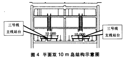 该方案的结构及特点基本同方案一。其换乘方式为站台与站台之间的换乘。由于结构尺寸比方案一窄1m,车站施工时占用道路较少。整个环控系统比较合理。 存在的问题是,根据支线客流及一号线体育西路站的现状,主线规模偏小,支线规模偏大。4)方案四。平面双10m岛结构方案,见图4。