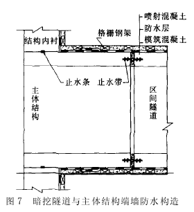 4)变形缝处浇注混凝土时, 先浇注止水带处的混凝土, 并用捣固器人工加强振捣; 变形缝一侧混凝土养护至规定强度后, 只拆除挡头板的支架方木和钢筋, 采用相同的方法固定另一侧的止水带, 混凝土浇筑时也先浇筑该部位的混凝土, 并加强振捣。 5)结构变形缝处的柔性防水层搭接接头处理时,需在变形缝两侧 1 m 范围内加一层聚氨酯防水层。4 区间隧道与车站接口处防水措施 区间暗挖隧道与车站之间相接时, 受隧道防水层收口困难和施工条件较差的影响, 极易在接口处产生渗水, 深圳地铁一期工程部分暗挖隧道与车站主体结构端墙防水采用了图 7 所示的构造。