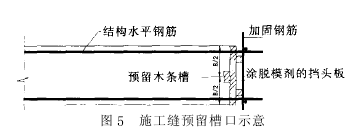 1)施工缝处挡头板是保证该处混凝土施工质量的关键, 预留橡胶条槽口的挡头板应牢固可靠并封堵严密、不漏浆; 挡头板用短钢筋焊接固定于结构纵向通长钢筋上, 以保证挡头板的平整和混凝土浇筑时不移位; 挡头板与钢筋及围护结构之间的间隙, 用小木板填塞严密以保证挡头板不漏浆; 板墙施工缝尽量保持在一个截面上, 其构造见图 5 所示。
