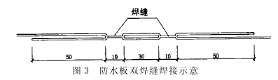 1) 在初期支护背后注浆。当初期支护无明显渗漏现象后, 再进行防水层施工, 初支混凝土必须均匀密实。 2)初期支护与二次衬砌之间采用 PVC 复合防水板全封闭防水。安装防水板之前抹一层 2 cm 厚找平砂浆, 以保证初期支护面平整; 在渗水严重处抹防水砂浆, 确保防水板施工时无水作业。 3)PVC 防水板铺设时, 严格按照以下措施进行: a.固定塑料垫圈 测量标出纵向中线, 沿中线向两边用射钉枪打入钢钉固定塑料垫圈。塑料垫圈固定点以梅花状排列纵横向间距在拱部为 50 cm、边墙为 100 cm、底板为150 cm。 b.铺设防水板 剪裁卷材时, 考虑预留搭接长度 50 cm, 铺设时由中线向两边铺设, 用压焊器将防水板热合在塑料垫圈上, 见图 2 所示。整个防水板铺好并检查确认后, 再用塑料热合机焊接搭接处; 防水板采用双焊缝焊接, 搭接长度不小于 15 cm, 每条焊缝宽为 1 cm, 两条缝间留 3cm 宽空腹, 作为检查焊缝密封性用, 见图 3 所示。